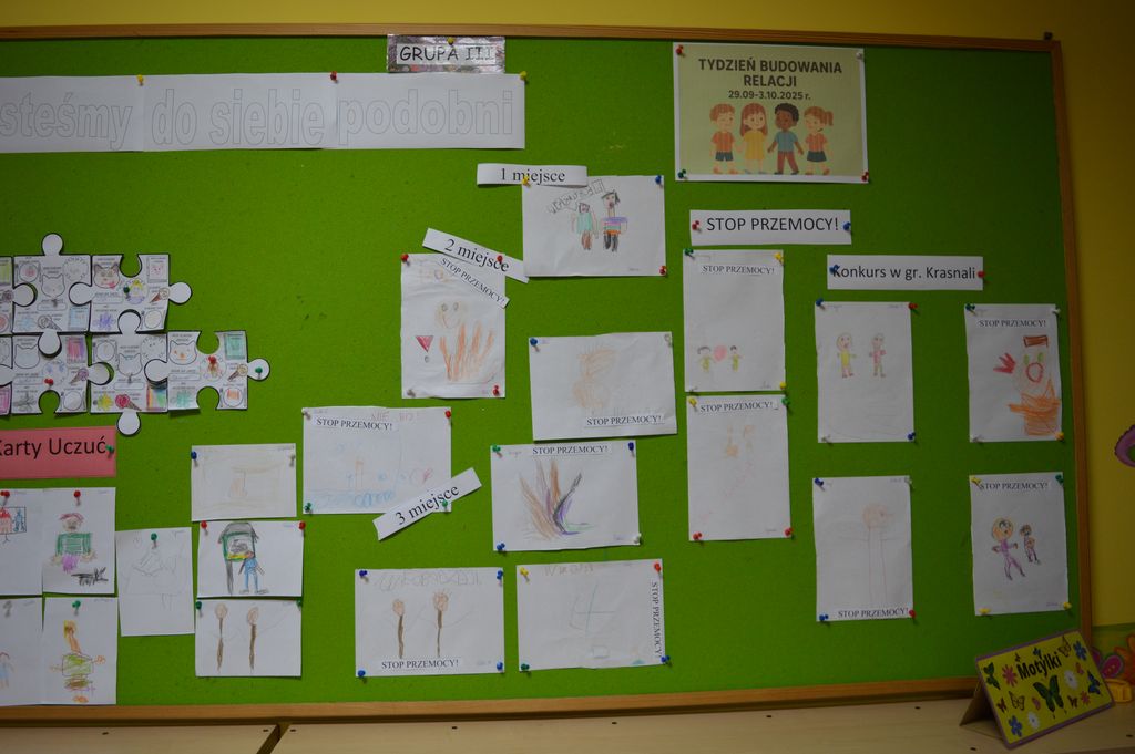 Kolejnym ważnym punktem tygodnia był udział w konkursie plastycznym „Stop przemocy”, w którym dzieci wyraziły swoje przemyślenia i uczucia na temat bezpieczeństwa, empatii i wzajemnego szacunku – zarówno w przedszkolu, jak i poza nim.