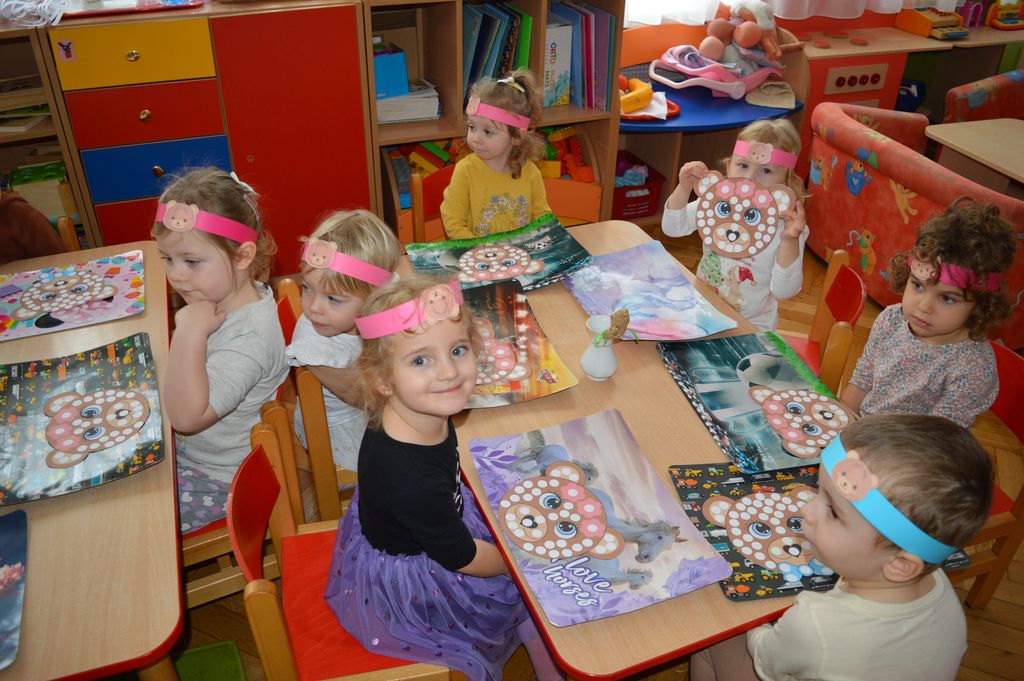 Nie zabrakło również działań plastycznych – powstały piękne wyklejanki i kolorowanki, które ozdobiły nasze przedszkolne sale. Jedną z największych atrakcji była możliwość wykonania pamiątkowej fotografii w specjalnie przygotowanej misiowej fotobudce.