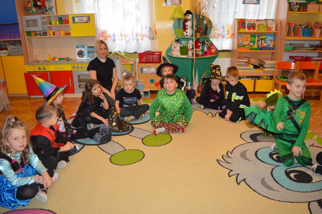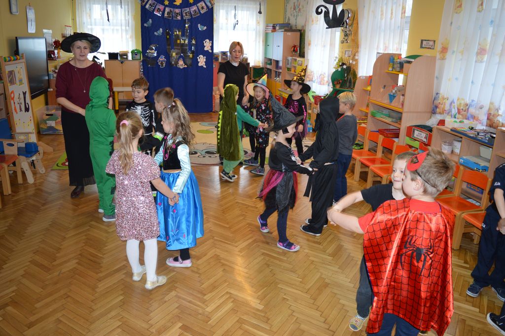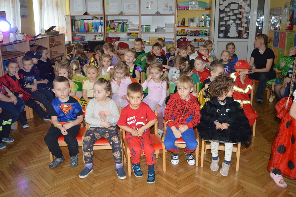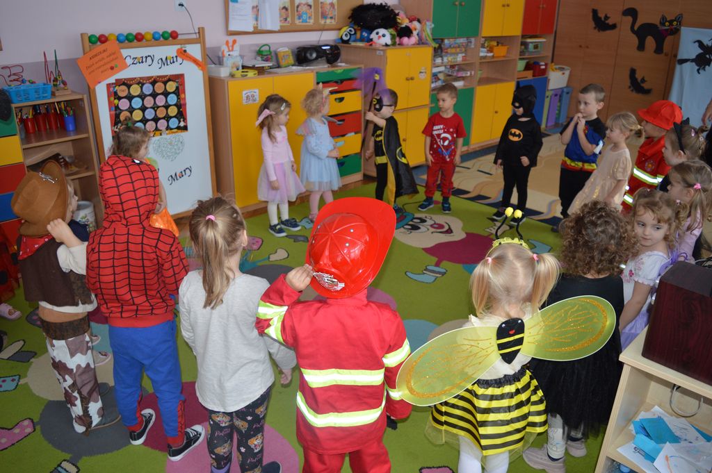 Nie zabrakło również kolorowych przebierańców – dzieci pojawiły się w strojach różnych postaci, co dodało wydarzeniu wyjątkowego charakteru. Całość uzupełniały pląsy przy muzyce, zabawy sprawnościowe i integracyjne, które dostarczyły dzieciom wiele radości i ruchu.